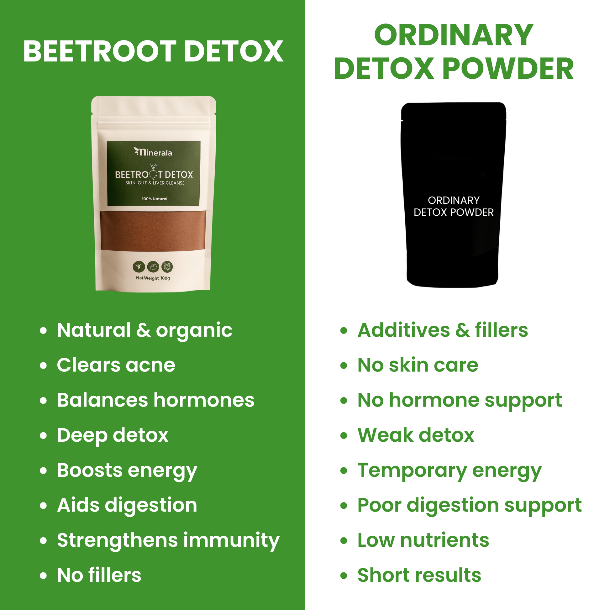 Bring back your natural glow with Minerala Beetroot Detox Powder – a vibrant, nutrient-rich blend designed to detoxify your body, clear skin, and support overall wellness. Packed with superfoods and antioxidants, this blend works from the inside out to fight acne, balance hormones, and boost vitality.